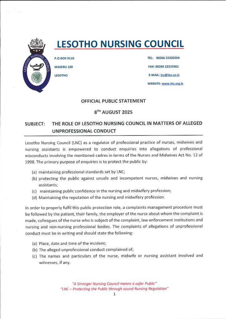 The Lesotho Nursing Council (LNC) is a statutory regulatory body established by the act of the Parliament and continues to exist in terms of the Nurses and Midwives Act, 1998 ( Gazette No. 49 of 17th June, 1998)